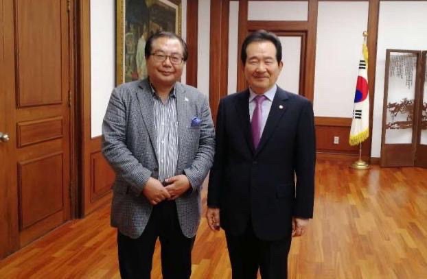 时任大韩民国国会议长丁世均在办公室与肖武男(左一)会晤